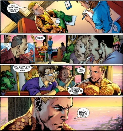 The ‘Super Friends’ cartoon comes to mind which gave the impression that he was more useless than Robin and those damn Wonder Twins put together. One major departure from the original is that Arthur grew up on land with his human father and didn’t know much about his mother, or where she came from, but was always drawn to the ocean. I bring your attention to an exchange in issue one. It’s explained that Arthur doesn’t talk to fish, he manipulates sea creatures.