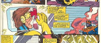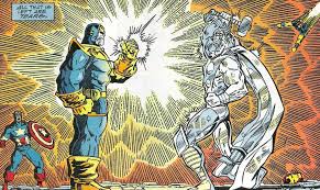 Finally it’s all down to one man: Captain America. Cap, being Cap, is like “whatevs” and strolls up to Thanos, talking shit. Right before Thanos deals a death blow, Adam Warlock sends the Silver Surfer after him. Flying like a gazillion miles an hour, he tries to snatch the gauntlet off of Thanos’ hand, but misses by less than an inch. Thanos then kills Cap, and wills himself to full power for the REAL battle: the cosmic entities have shown themselves.