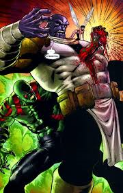 Right before the fight begins, Thanos is again rejected by Death, which really cheeses him off. In response, he creates the perfect mate for him out of nothingness. So right before a bunch of unprepared fighters show up he’s mad as hell and a bit nuts. Great.