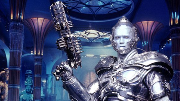 The entire sequence that follows is simply painful to watch. The entire museum looks fake, the extras are so unconvincing, the “special effects” are laughable, and even the ice itself looks like plastic. When Batman and Robin show up, Batman kindly introduces himself to Mr. Freeze, and Robin makes a perfect Robin symbol as he busts through the wall on his bike. Wait, where did those ice skates come from? If he’s a ‘new villain’ why did they come prepared to take on a cold-themed bad guy? Mr. Freeze himself looks absolutely terrible. Like really really bad. His face is painted blue, his teeth glow, and his shinny silver suit looks like it was ripped off a Cylon from the 70’s. His ‘ice gun’ looks like one of those big super soaker squirt guns wrapped in tin foil.