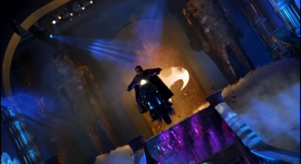The first couple lines of the movie are downright terrible, but I’d be willing to let it slide if THE ENTIRE SCRIPT wasn’t haphazardly cobbled together from awful dialogue, crappy one liners, and the cheesiest puns this side of the craft factory. Then we see Robin’s bike, the Red-Bird, emerge from the same driveway thingy that the Batmobile came out of, which doesn’t make any sense, but it gets worse: the bike is encased in a neon coffin that when opened makes a Robin symbol over the Bat-symbol to reflect the movie’s logo, just in case we were confused which movie we were watching? The logistics of this entire set up doesn’t make any sense. Are they expecting visitors? Are they putting on a stage play of their exploits for the world to see? The only people who are ever going to ‘appreciate’ the way Robin’s bike makes it’s entrance are Dick Grayson and Alfred, because Batman is already well on his way to the crime scene in his no passenger vehicle, while Robin awaits his motorcycle’s slow reveal.