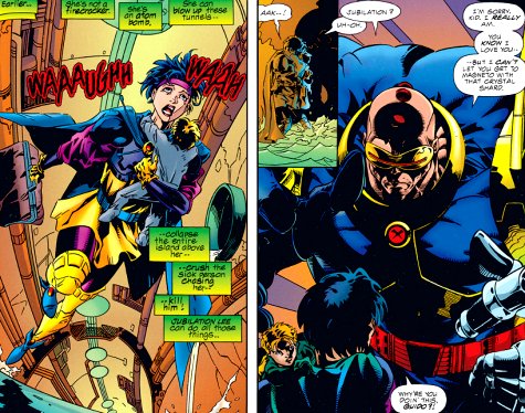 The two of them encounter the robot Nanny that is caring for Magneto’s son, and suddenly that bastard Strong Guy reveals he is actually working for Apocalypse, and destroys Nanny, taking the crystal shard AND Magneto’s son and leaving a distraught Jubilee behind to wonder wtf just happened. Gambit and Lila run into the traitor, but in the chaos the tunnels start collapsing, and faced with the choice of saving li’l Charles and the crystal or saving Lila, Gambit chooses Lila. Strong Guy takes the baby and the shard to the big A.