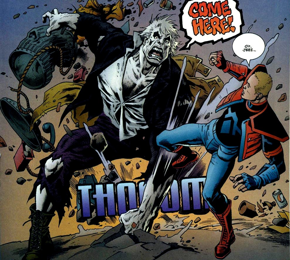 This makes no sense. I guess they were trying to come up with names for a speedster, and when they hit on Speed Demon, they were like, “Well, there’s the Flash, and we need a demon…. fuck it, Ghost Rider.” It just looks like a shitty Ghost Rider design for a version that runs fast instead of having a sweet bike.