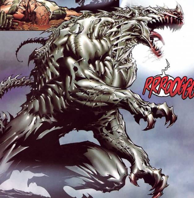 Predator X attacks Bishop, biting his arm off. Cable (plus baby), the Professor, and everyone scramble, and break back into the chaos of the big fight. Predator X eats a few Marauders, and Wolverine attacks it. Realizing he can’t get through its skin, the crazy Canuck lets the damn thing EAT HIM, and goes to work on its insides, eventually cutting his way out (EWWWW).