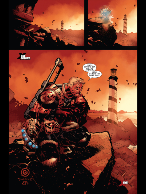 The stunned X-Men gather around the body, and Cyclops states there are no more X-Men, not anymore. The Professor’s body is teleported away. In the future, Cable arrives with the baby, thinking “now comes the hard part”.