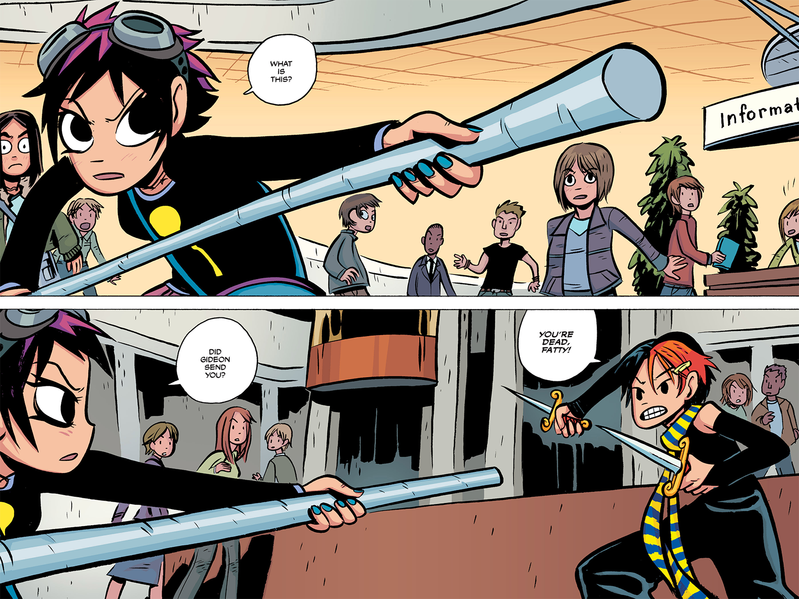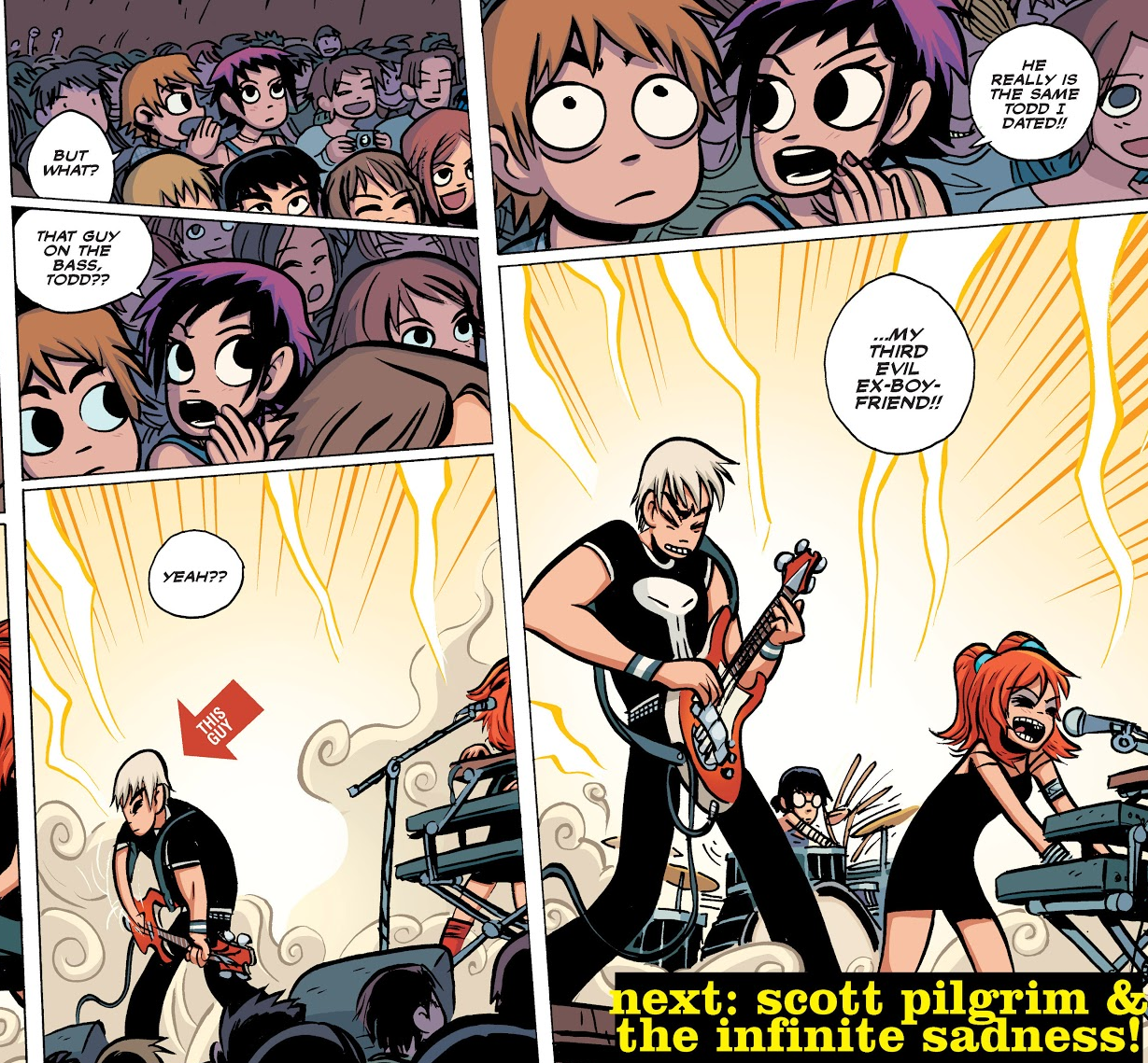They arrive at Lee’s Palace for the show, there’s some inter-character drama, Knives shows up with Neil and Knives finds out that Scott used to date Envy Adams, who she’s also obsessed with. The book ends on a cliffhanger when Envy walks onto stage and Ramona recognizes the guy on bass, it’s Todd! And it turns out it’s the same Todd – Ramona’s Third Evil Ex Boyfriend!