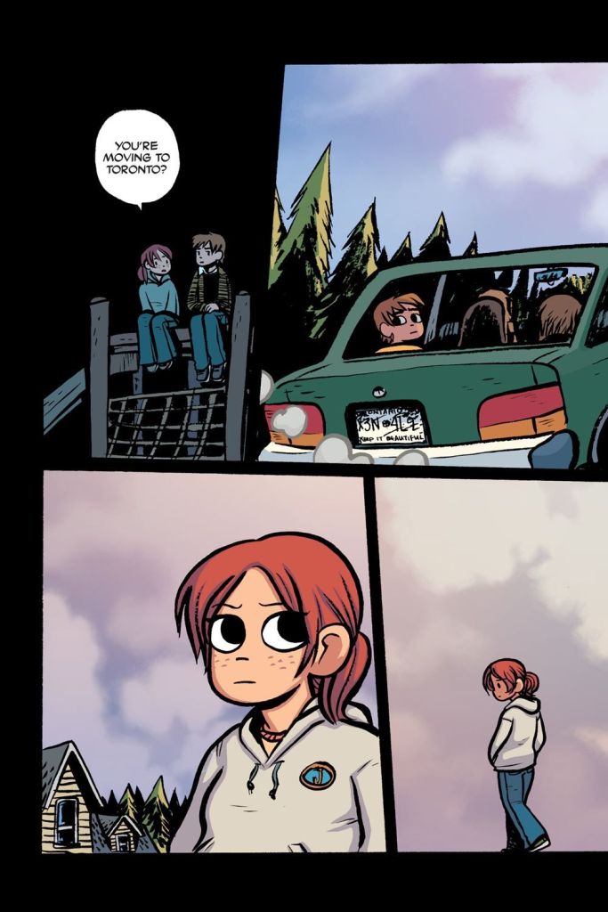 Next, O’Malley gives us one of the most heartfelt montages as we see Scott and Kim dating, going out with friends, playing video games together, rocking out in their band, sharing their first kiss under a tree, etc. The use of panels here is extremely effective, in fact, I got a little choked up, because it evoked memories of what it was like to be that age. It’s bittersweet, because we know that they ultimately don’t stay together – but it’s reinforced by that last page of the sequence, which just shows Kim and Scott sitting together on a playground, at night. The only bit of dialogue is Kim saying “You’re moving to Toronto?” The very next panel we see Scott looking back through the rearview window as his parents drive away…