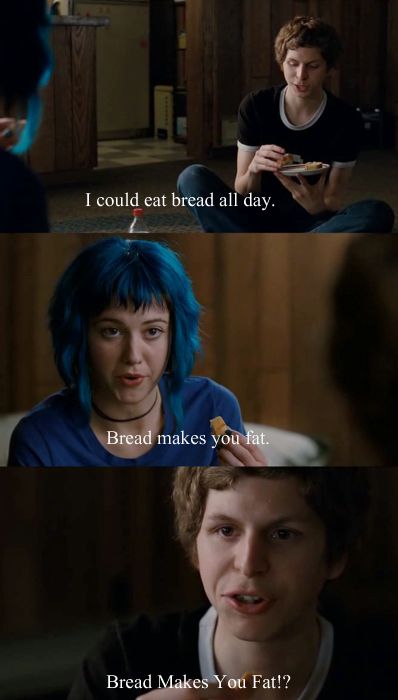 There’s a lot of great moments in this one, like the famous exchange between Scott and Ramona about how bread makes you fat – Scott says, “Garlic bread is my favorite food. I could honestly eat it for every meal. Or just all the time without even stopping.” Ramona responds, “You’d get fat.” “No.” “You’d get totally fat.” “I don’t think I’d get fat. Why would I get fat?” “Bread makes you fat. Butter makes you fat.” “Bread makes you fat??!!” The line delivery in the movie version gets me every time to this day, and I still laughed out loud reading it on the page.