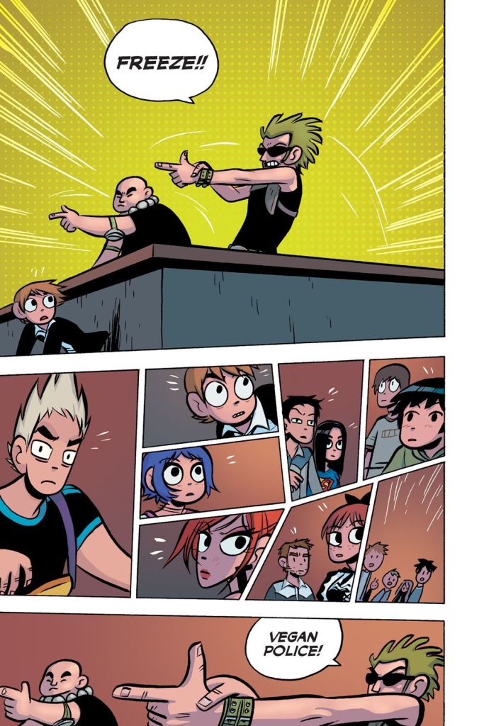 Vol 3 of the Scott Pilgrim saga picks up where we left off last time with The Clash at Demon Head concert, where Scott and Ramona realized that Envy’s bass player / boyfriend is in fact the same Todd that Ramona used to date! For those keeping track, in the movie version this whole volume was basically summed up in one scene: the fight between Scott Pilgrim (23 year old, indecisive loser-hero hybrid) and the Vegan-powered Todd!