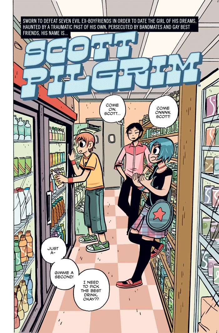The Color Edition of Scott Pilgrim Vol 3 also includes the 2006 Free Comic Book Day issue of Scott Pilgrim, which includes one of my favorite moments where Ramona and Wallace are getting impatient with Scott taking his time, reading labels, trying to decide which drink he should get at the convenience store, based on their power ups.