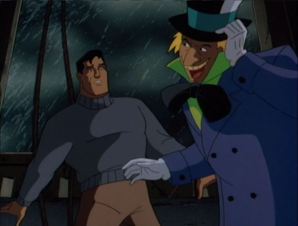 By far one of the most deep and introspective episodes is “Perchance to Dream”! It’s also easily the best Mad Hatter storyline in Batman lore to date. Bruce Wayne wakes up to a world where his parents are still alive, he’s engaged to Selina Kyle, and (gasp!) he isn’t Batman!? It’s all too good to be true, but Bruce can’t shake the feeling that something’s not right. In a twist worthy of The Twilight Zone, Bruce realizes that he’s trapped in some kind of dream state because he’s unable to read the newspaper, and the only way to wake up from the dream is to… commit suicide?! Bruce climbs to the top of a bell tower during a storm and confronts “Batman” who rips off his cowl to reveal the Mad Hatter who monologues at him about the nature of reality. Ultimately, Bruce sees through the charade, wakes up from the mind control trance, and punches the crap out of the Mad Hatter before continuing to be Batman.