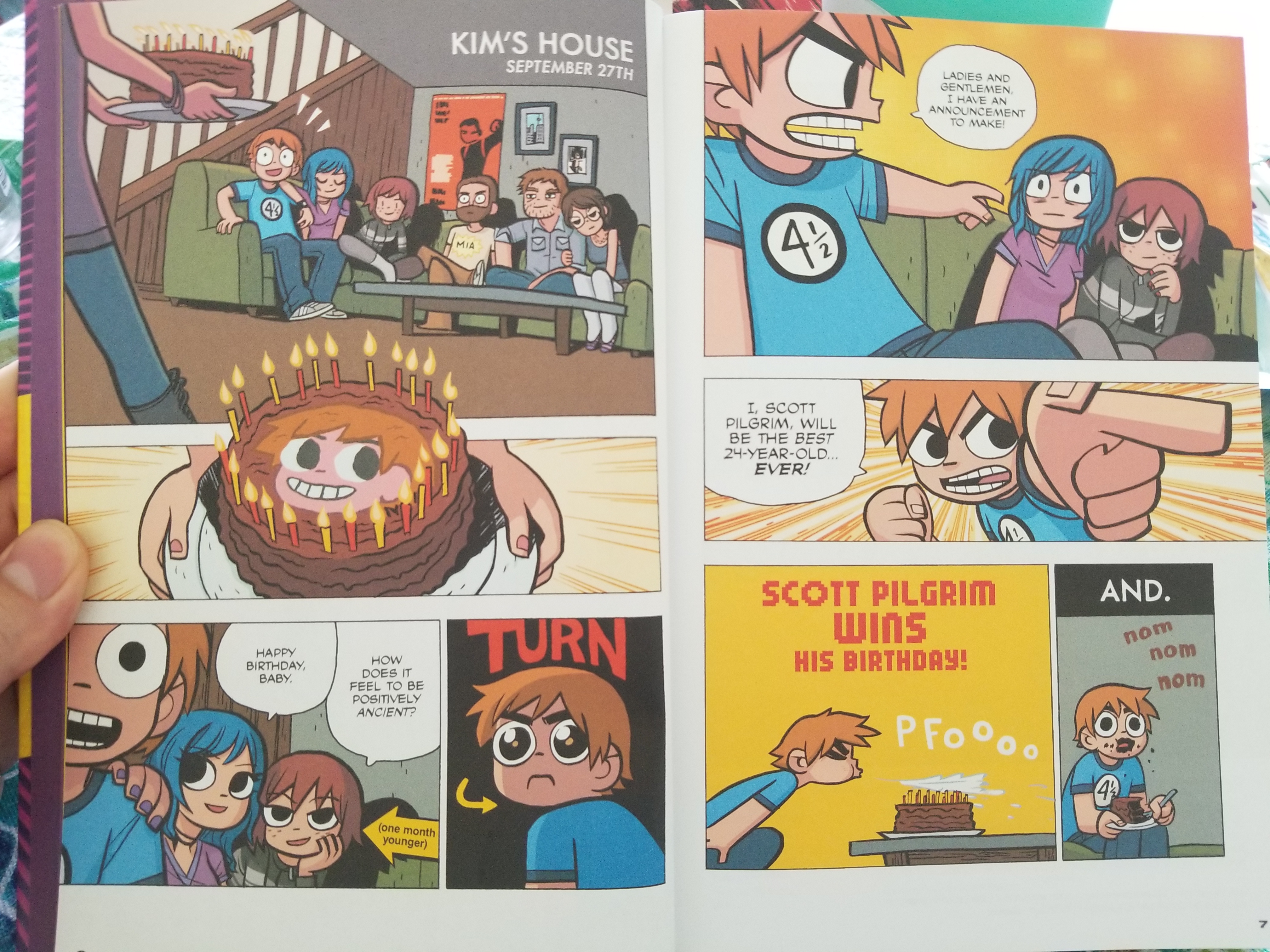 Bryan Lee O’Malley’s “Scott Pilgrim vs the Universe” is the fifth volume of the Scott Pilgrim and like the previous one, has very little in common with the film adaptation. The book follows up on the happy ending of Vol 4 where it seems as though Scott and Ramona are finally overcoming their pasts. Scott has vanquished the first four members in the League of Evil Exes, but this time he’ll have to contend with the Katayanagi Twins! But first, the book randomly opens with Scott’s 24th birthday with a super anime inspired overreaction to being called old and then a hilarious panel of him nomming on some chocolate cake.