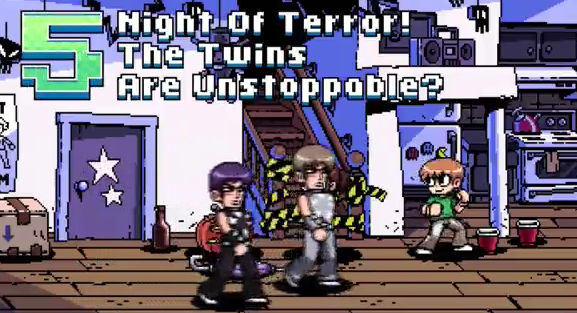 At another one of Julie’s themed parties, Kim Pine tries to mend some awkwardness between them. After defeating another one of the Katayanagi robots, Scott joins the two in drinking a whole bottle of tequila! Scott asks Ramona, “Have you ever dated anyone who wasn’t evil? – Not that fighting harder and harder battles for your love is getting old, or anything…” She responds, “Yeah, once, this guy Doug. He was kind of a dick, though.” Then, after getting super drunk with Ramona and Scott, Kim is making her way home when she’s suddenly kidnapped by the twins!