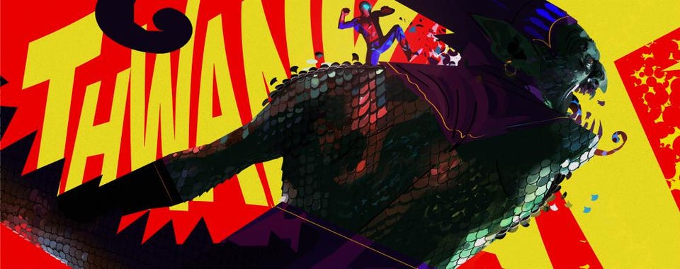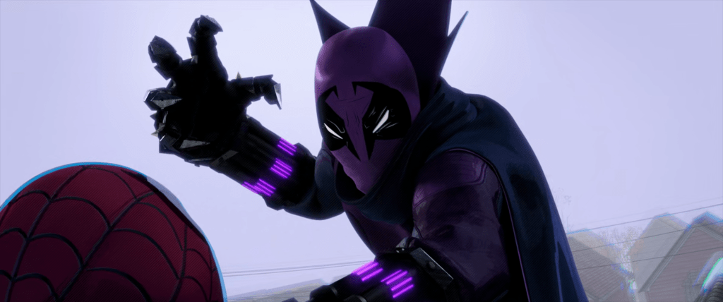 They also managed to blend 3D and 2D assets seamlessly to the point where you can’t really tell either way. Another inspired visual choice was the use of half tone four color dots throughout, evoking the printing style of old school comics! To further emphasize this overt comic book connection, we’re even given word balloons, caption boxes, visualized sound effects (Thwip!), and even the occassional use of multiple panels during a montage or transition – which are sometimes used for comedic effect. Story aside, every frame of this movie is a work of art in it’s own right.
