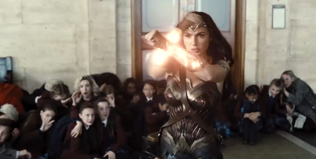 We also get reintroduced to Wonder Woman kicking ass in London, in one of the single coolest action sequences since the “no man’s land” scene in the first WW movie. She saves an entire field of students from a nihilistic terrorist with a machine gun and a suitcase nuke before obliterating him with her gauntlets!