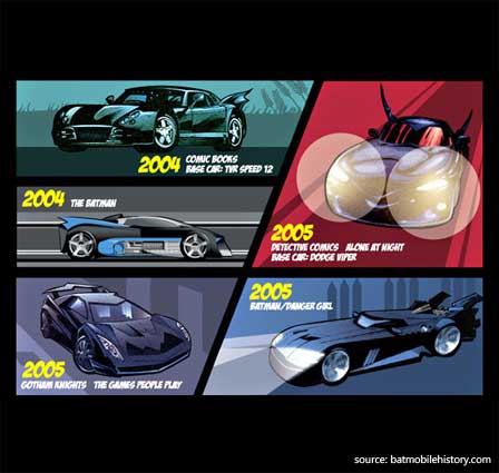 Following the Burton and Schumacher movies, the late 90’s and early 2000’s gave us A TON of new and wildly different designs for the Batmobile throughout the comics and cartoons, many of whom took heavy inspiration from those earlier versions, including but not limited to the Batmobile from ‘Batman: The Brave and the Bold’ which blends the 60’s version with the original 40’s look. One design that became a visual trope for many Batmobiles to follow was the red-tinted windshield. This article would be a book if I went into detail about each one, but some of the highlights are shown in the images above. (See more at Batmobilehistory.com)