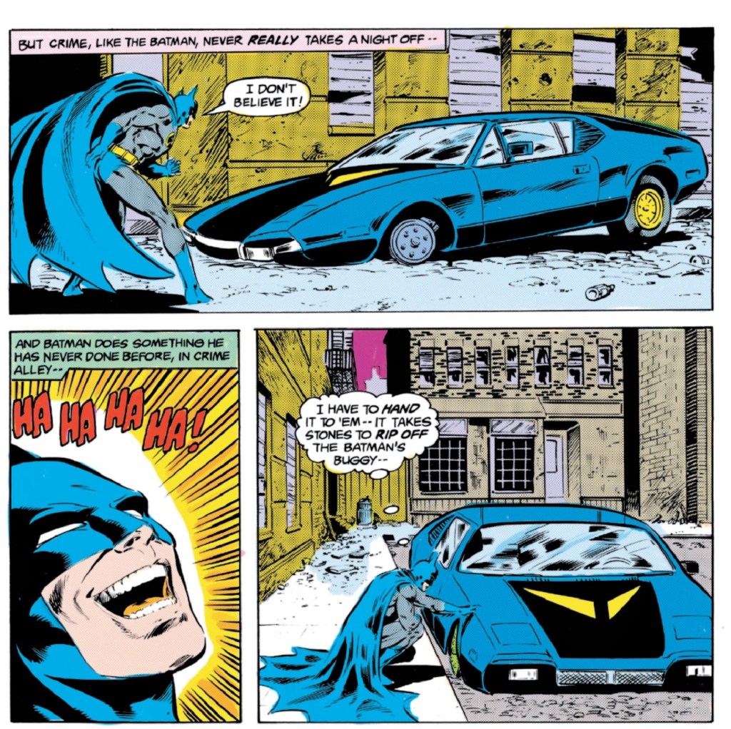 A fan-favorite design from the iconic Denny O’Neill / Neal Adams comics run of the 1970’s! A slick and simple black and blue sports car, with that ominous silhouette on the hood scaring the shit out of Gotham’s underbelly as it came tearing down the streets. This also happens to be the one that Jason Todd jacked the wheels off of that one time, before being recruited as Robin…