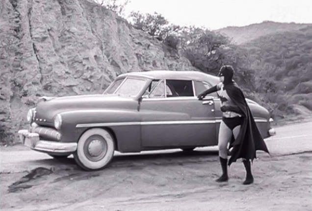 In the super low budget, black and white serials from the 1940’s, Batman (and Robin) literally just drove around in Bruce Wayne’s personal vehicles, which wasn’t at all suspicious for some reason? One look at Batman’s cheap felt costume and you can tell why they didn’t bother even putting a bat symbol on these ones.