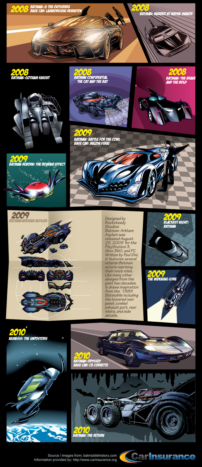 Following the Burton and Schumacher movies, the late 90’s and early 2000’s gave us A TON of new and wildly different designs for the Batmobile throughout the comics and cartoons, many of whom took heavy inspiration from those earlier versions, including but not limited to the Batmobile from ‘Batman: The Brave and the Bold’ which blends the 60’s version with the original 40’s look. One design that became a visual trope for many Batmobiles to follow was the red-tinted windshield. This article would be a book if I went into detail about each one, but some of the highlights are shown in the images above. (See more at Batmobilehistory.com)
