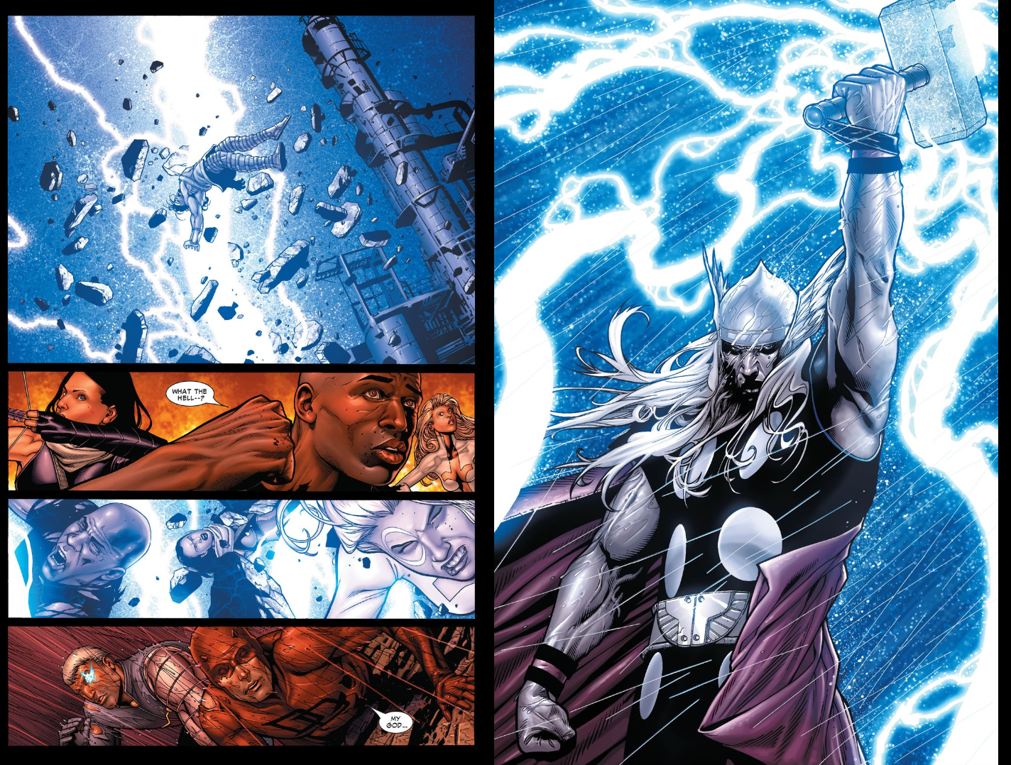 The fight seems to be turning Team Cap’s way after Hercules rips through the place, but then suddenly a bolt of lightning hits him, then starts hitting everyone, and Cap’s team messes their collective pants, because holy shit is that Thor…?