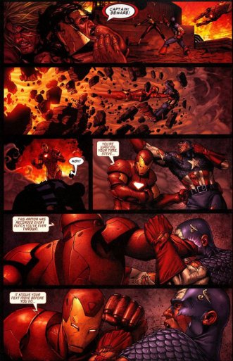 Captain America’s team goes to an oil field they believe is under attack, but it’s a trap set by Stark and SHIELD, and instead of finding people in trouble they find Iron Man’s team waiting for them. Tony says he just wants to talk, but Cap hears that while seeing an army, multiple helicarriers, and SHIELD agents everywhere, and these are the same people he had to jump out of a flying aircraft carrier to get away from, so techincally he throws the first punch, but what the hell was he supposed to do?