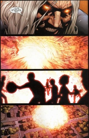 The story opens with a particularly crappy lineup of the New Warriors filming a reality TV show. In an attempt to boost ratings they have decided to raid a residential supervillain hideout on camera. They didn’t plan things through enough and one of the villains, Nitro, makes them pay for it. Nitro is the one that caused the death of the original Captain Marvel, Mar-Vell, and it’s ‘nice’ to see him get a boost here, but he didn’t have to go full raging asshole right off the bat. Nitro’s power is to cause explosions, and that he does, in the middle of a Connecticut suburb, right near an elementary school. Hundreds die, included every child and teacher at said school.