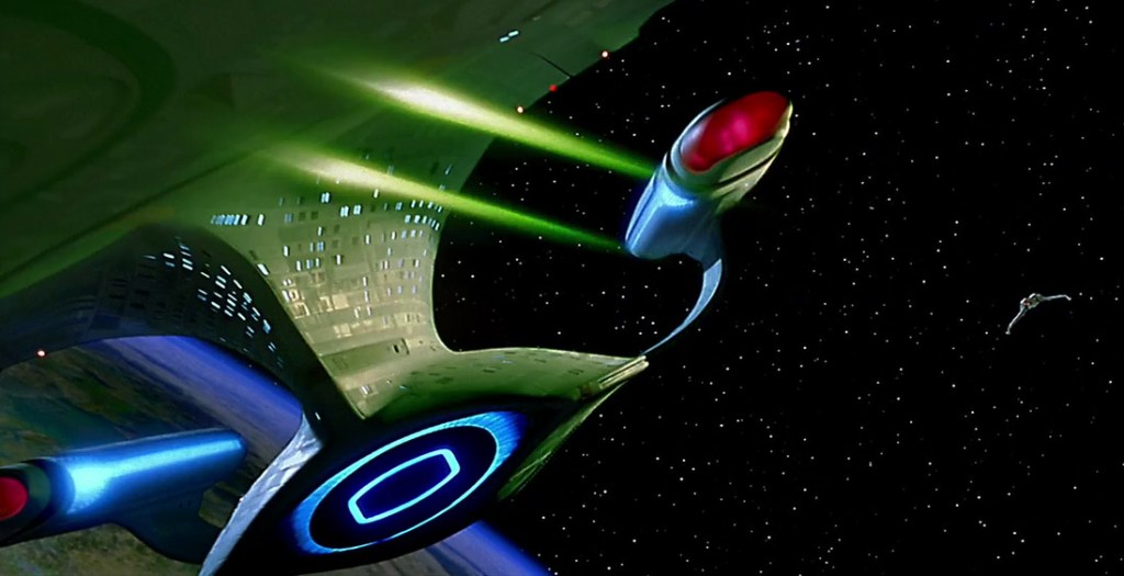Some of the things I love about Generations are that the movie starts with a cold open showing us Kirk’s “final” mission, the Enterprise-D tragically crashes into a planet, and it ends with the team-up we never thought we’d ever see: Kirk and Picard against a random villain (Malcolm McDowell) fighting on an alien planet that vaguely looks like Red Rock Canyon in Nevada. It just felt right.