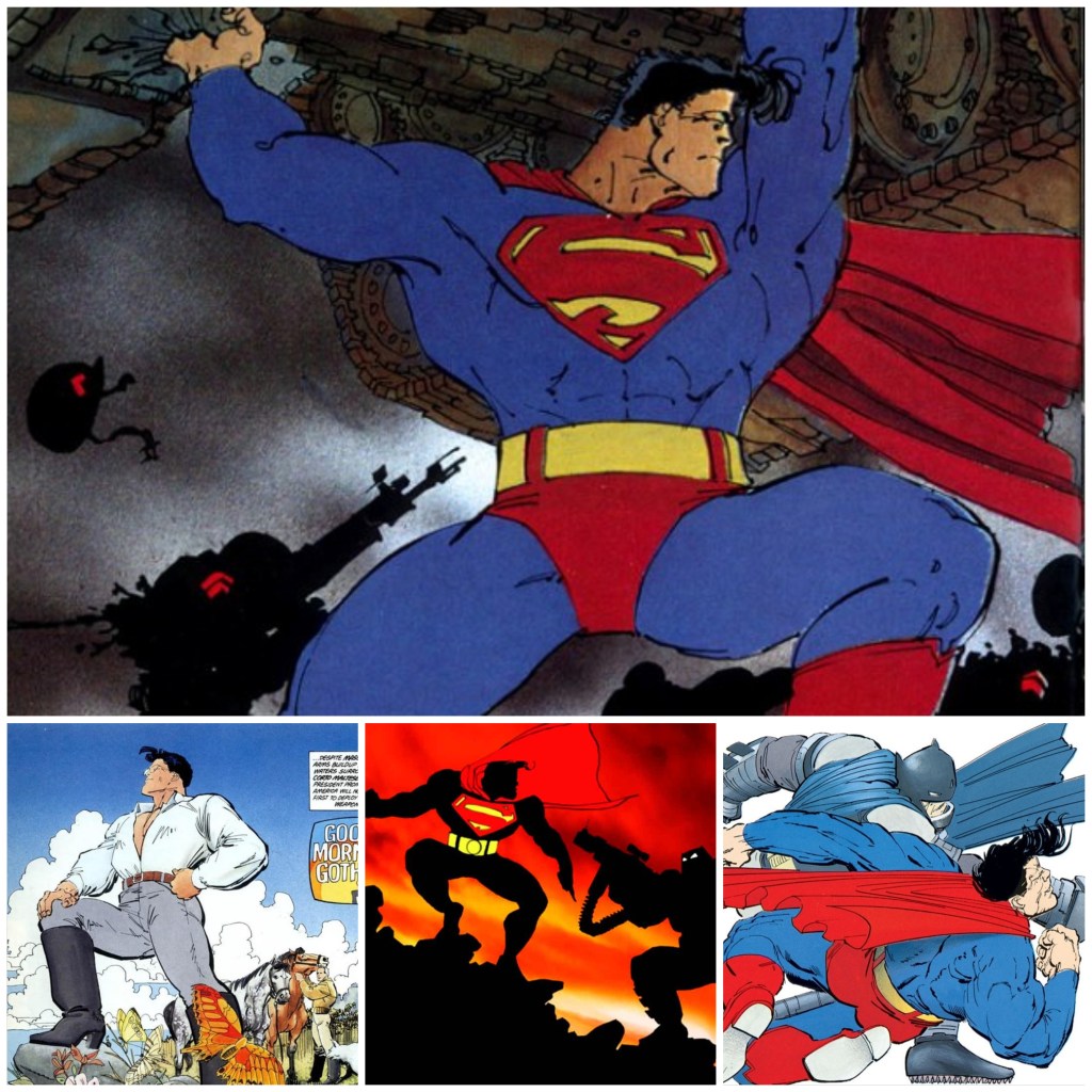 Frank Miller gave us a slightly more cynical take on Superman in his gritty 80’s graphic novel, “The Dark Knight Returns” where he’s written as a government stooge, and an antagonist to a world-weary Batman who decides to pick a fight with him in a mech suit… and wins!