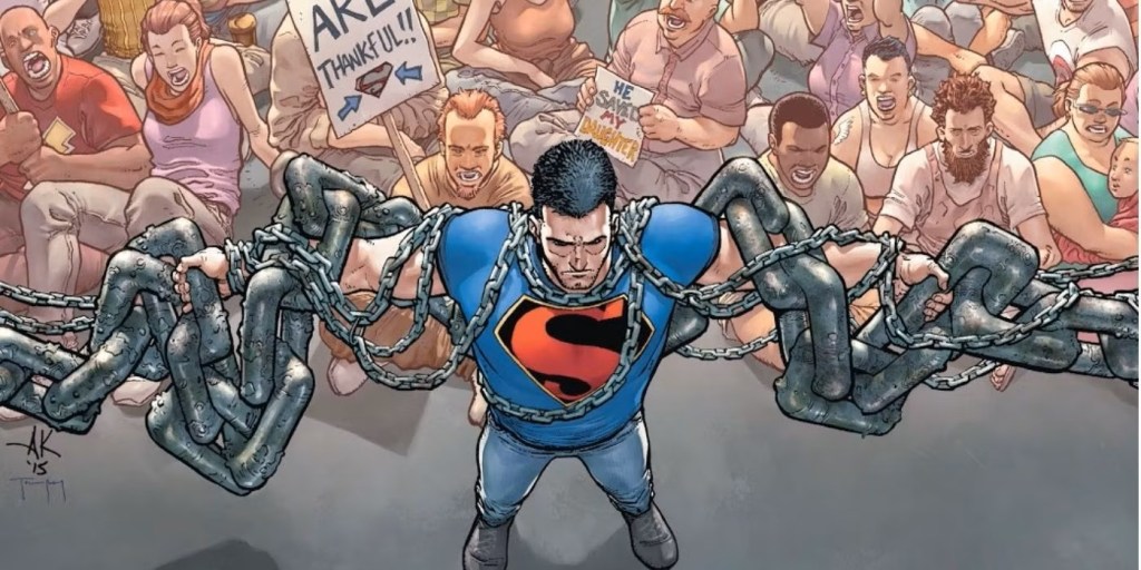 A continuation of the New 52 Superman, this storyline follows a significantly de-powered Clark who ditched the suit and cape for jeans and a t-shirt, now riding around America on a motorcycle. In one of the key moments of the series, Supes saves a group of protestors from police brutality by cops in riot armor!